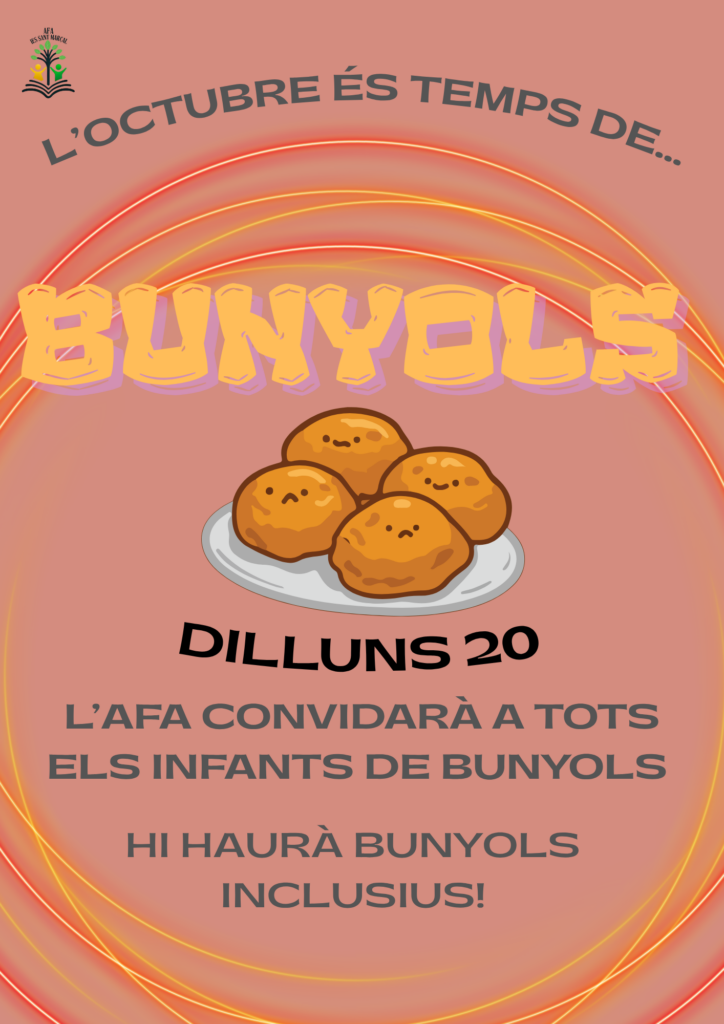 Publicado el octubre 17, 2025octubre 17, 2025 por adminL’AFA convida a bunyols El pròxim dilluns, 20 d’octubre, l’AFA convida a tot l’alumnat del centre a menjar bunyols.